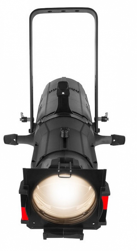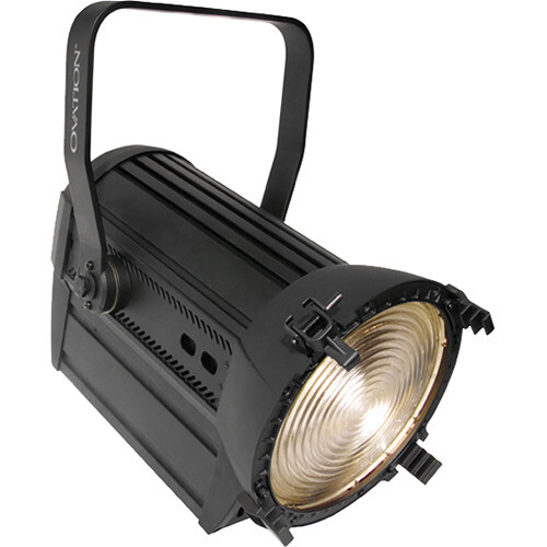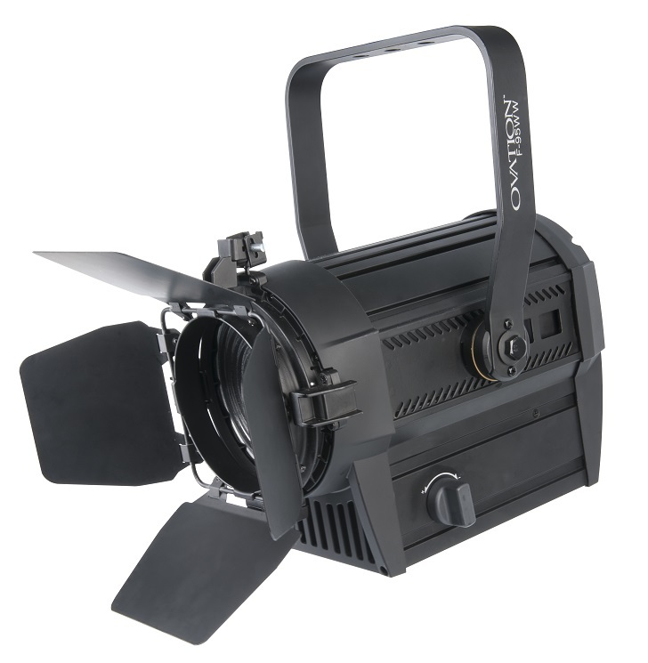 Ovation F-95WW- фонарь с линзой Френеля. Применяется для светового оформления фона, декораций, осветления предметов, используется в театральной/кино/фото индустрии. Обеспечивает красивую, мягко-заполненную теплым тоном заливку цветового луча. Для светового потока используются 9 светодиодов мощностью по 10 Вт/2,8 А, с цветовой температурой 3199 К и расчетным ресурсом работы в 100000 часов. Характеристики лампы позволяют использовать эти прожекторы вместе с традиционными светильниками Френеля. Прожектор поддерживает все привычные режимы работы, включая операции в последовательно подключённом порядке,16-ти битное затухание до полной темноты. Моторизированный механизм изменения угла освещения (толщины луча) управляется дистанционно, при помощи DMX соединения. Запрограммированные режимы и макросы отсутствуют.