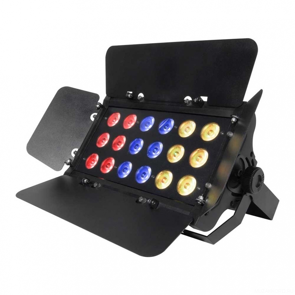 Это светодиодный прожектор рассеянного света. В конструкции светодиодного эффекта используется 18 RGB светодиодов, мощностью 3 Вт (каждый). Угол раскрытия составляет 17 гр, угол засветки - 32 гр. Питание эффекта возможно в любой стране от стандартной розетки электрического питания: 100-240 В/50-60 Гц, потребление энергии не более 109 Вт. Для удаленного управления есть возможность использования внешних контроллеров DMX - 3/5/9/13 каналов. Размеры устройства составляют 389 х 197 х 187 мм, вес - 3,2 кг.