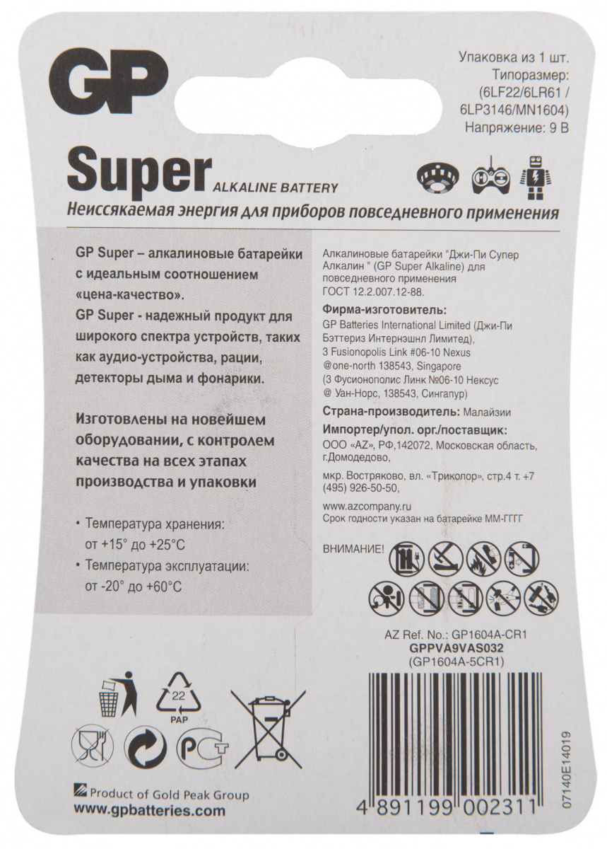 GP 1604A-5CR1 Батарейка (Крона) 1 шт.
