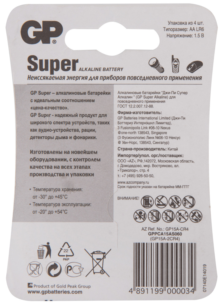 GP 15A-2CR4 Батарейки АА, 4 шт