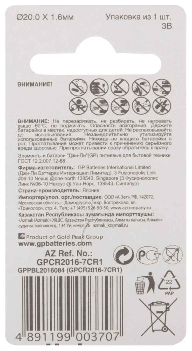 GP CR2016-7CR1 Батарейка, 1 шт.